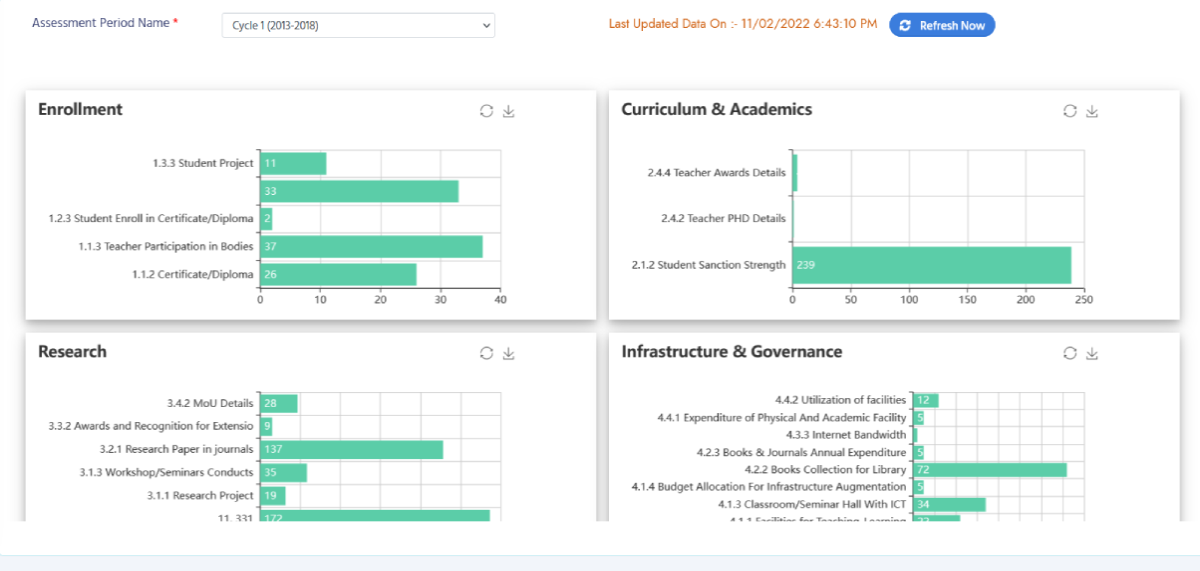 Provides actionable meaningful insights via real-time analytics dashboard to gauge the assessment cycle and gives clarity to faculty and admin staff regarding complete data entries & audit log. Offers graphical insights to depict present and expected targets. The analytic dashboard enables institutional planning and helps in making informed decisions.
